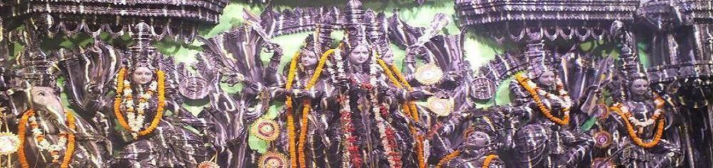 Durga Puja is the biggest festival in Bengal. This is also known as Dussehra and Navaratri in other parts of India. Durga is the Goddess of divine power against all evils. The story goes that Mahisasur, the Buffalo Demon, through years of praying, received blessing from Lord Brahma, that no power can kill him which means he is invincible. But once gaining this power he started ravaging the whole world and killing people. And finally he wanted to uproot the Gods too. The Gods, in dismay, combined their powers to create a beautiful maiden, and each placed his or her most potent weapon in one of her ten hands riding a lion. Her return in each year in the Bengali month of Aswin (September-October) commemorates Rama's invocation of the goddess Durga before he went into battle with Ravana. The traditional image of the Bengali Durga follows the iconographic injunctions of the Shastras. It is similar to the Durga of Aihole and of Mahabalipuram (seventh century). The tableau of Durga with her four children - Kartik, Ganesh, Saraswati and Lakshmi, representing respectively the Protector, the Initiator of the puja, Knowledge and the Provider - signifies the complete manifestation of the goddess.